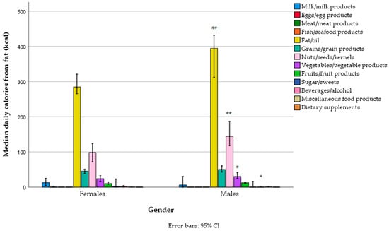 Fat-related energy intake from different food groups across gender categories in a sample of vegetarians/semi-vegetarians 18–74 years old (n = 314) living in Serbia (* p < 0.05, ** p < 0.01).