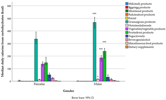 Carbohydrate-related energy intake from different food groups across gender categories in a sample of vegetarians/semi-vegetarians 18–74 years old (n = 314) living in Serbia (* p < 0.05, *** p < 0.001).