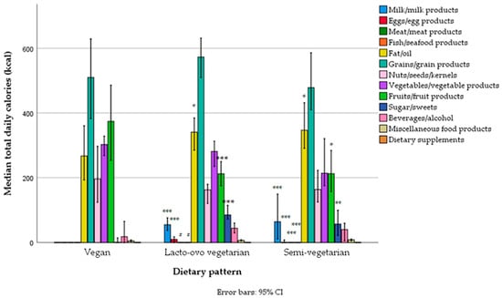 Total daily energy intake from different food groups across different vegetarian/semi-vegetarian dietary patterns in a sample of 18–64-year-old vegetarians (n = 314) living in Serbia. (Legend: *** p < 0.001, ** p < 0.01, * p < 0.001—statistically significantly different from vegans; # p < 0.001—statistically different from semi-vegetarians).