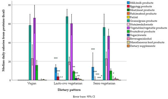 Protein-related daily energy intake from different food groups across different vegetarian/semi-vegetarian dietary patterns in a sample of 18–64-year-old vegetarians/semi-vegetarians (n = 314) living in Serbia. (Legend: *** p < 0.001, ** p < 0.01, * p < 0.001—statistically significantly different from vegans; # p < 0.001—statistically different from semi-vegetarians).