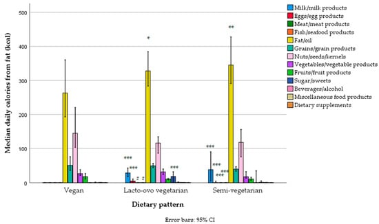 Differences in fat intake from specific food groups were similar, with vegans having a much lower intake of fat not only through animal products but also through sweets and edible fats and oils, while lacto-ovo vegetarians and semi-vegetarians differed only in fat intake from meat and fish (Figure 7, Supplementary Table S7a). Differences from vegans persisted even when the data were expressed as the percentage of total daily energy (Supplementary Table S7b).