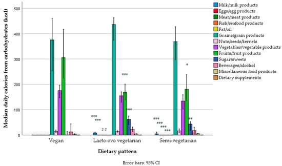 Carbohydrate-related daily energy intake from different food groups across different vegetarian/semi-vegetarian dietary patterns in a sample of 18–64-year-old vegetarians/semi-vegetarians (n = 314) living in Serbia. (Legend: *** p < 0.001, ** p < 0.01, * p < 0.001—statistically significantly different from vegans; # p < 0.001—statistically different from semi-vegetarians).