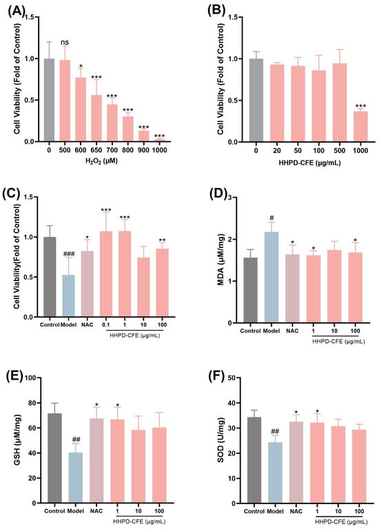 Effects of HHPD-CFE on H2O2-induced cellular injury in BRL cells. (A) Effect of H2O2 (500–1000 µM) on the viability of BRL cells. (B) Effects of HHPD-CFE on the viability of BRL cells. (C) Effect of HHPD-CFE on restoring the cell growth in BRL cells exposed to H2O2. (D–F) Effect of HHPD-CFE on MDA, GSH, and SOD in H2O2-treated BRL cells. Data are shown as mean ± SD (n = 3); # p < 0.05, ## p < 0.01, ### p < 0.001 (compared with the control group); * p < 0.05, ** p < 0.01, *** p < 0.001 (compared with the model group).