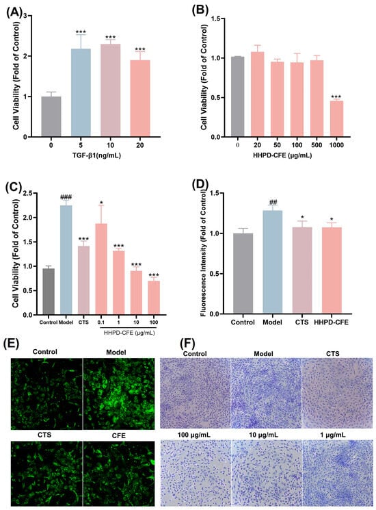 Effect of HHPD-CFE on TGF-β1-activated HSC-T6 cells. (A) A cellular fibrosis model with TGF-β 1-stimulated HSC-T6 cells was established. (B) Effect of HHPD-CFE on the viability of HSC-T6 cells. (C) Effect of HHPD-CFE on the proliferation of HSC-T6 cells activated by TGF-β1. (D,E) Effect of HHPD-CFE on TGF-β1-induced collagen I deposition in HSC-T6 cells. (F) Effect of HHPD-CFE on TGF-β1-induced fibrotic collagen deposition in HSC-T6. Data are shown as mean ± SD (n = 3); ## p < 0.01, ### p < 0.001 (compared with the control group); * p < 0.05, *** p < 0.001 (compared with the TGF-β1 group).