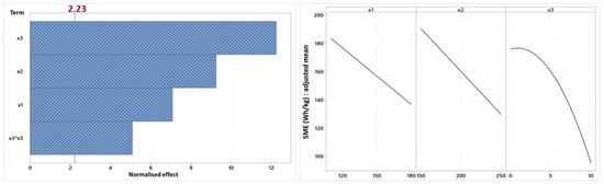 Pareto chart and factorial diagram of the main effects of the SME variable (x1: temperature, x2: screw speed (rpm), x3: oil content (%)).
