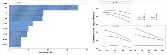 Pareto chart and factorial diagram of the interactions of the expansion ratio variable (x1: temperature, x2: screw speed (rpm), x3: oil content (%)).