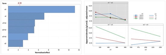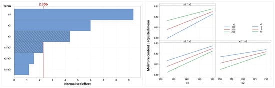Always linked with the textural properties, Figure 4 shows the Pareto chart and factorial interaction diagram for bulk density, which is an important quality attribute of extruded snacks linked to the number and size of gas bubbles developing in the starch matrix during the process [].