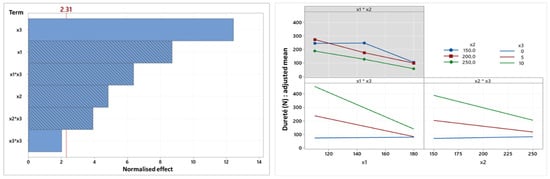Pareto chart and factorial diagram of interactions of hardness (N) (x1: temperature, x2: screw speed (rpm), x3: oil content (%)).