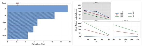 Pareto chart and factorial diagram of interactions relating to the variable compression work (N.mm) (x1: temperature, x2: screw speed (rpm), x3: oil content (%)).