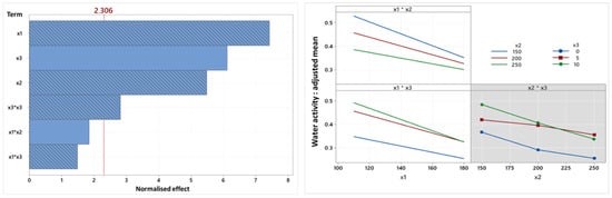 Pareto diagram and factorial diagram of interactions related to the water activity variable (x1: temperature, x2: screw speed (rpm), x3: oil content (%)).