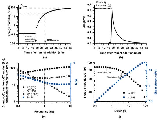 Dynamic (oscillatory) rheological testing of milk coagulation kinetics at 35 °C following rennet addition was performed in a Physica MCR 300 rheometer (Physica Messtechnik GmbH, Stuttgart, Germany) with a concentric cylinder geometry (CC27, diameter of cup and bob, 28.92 and 26.66 mm, respectively). Specifically, rennet (CHY-MAX® Powder Extra NB, Chr. Hansen A/S, Hørsholm, Denmark) and calcium chloride were added to 50 mL of milk (using amounts corresponding to 1 g and 15 g per 100 L of milk, respectively), preheated to 35 °C in a water bath under gentle stirring. The timer was set to zero at the moment of rennet addition, and stirring continued for 1 min to ensure complete dispersion. Subsequently, the milk sample was transferred to the rheometer, and measurements began 3 min after rennet addition to ensure consistency across tests. To avoid water loss during measurements, a thin layer of paraffin oil was applied over the samples. Coagulation kinetics were determined by applying small deformation oscillatory testing at a constant strain of 0.5% and a frequency of 1 Hz for 45 min at 35 °C, while the storage (G′) and loss (G′′) moduli and loss tangent (tan δ = G′′/G′) were continuously monitored (Figure 1a); the experimental set-up and protocols adopted in rheological testing were essentially as described by Lazaridou et al. [20]. For characterization of the coagulation properties, the following rheological parameters were calculated: rennet coagulation time (RCT) (min), defined as the time at which G′ exhibits an abrupt increase; elasticity increment (IE = (dlogG′/dt)max) as an index of coagulation rate (Figure 1b); time to reach G′ = 20 Pa (TG′=20Pa); and maximum storage modulus (G′max) (Pa) determined as the value of G′ at the end of the coagulation kinetics measurement (Figure 1a).