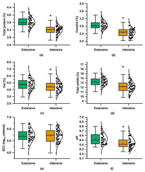 Boxplots and distribution of compositional and quality parameters of the milk samples from the Skopelos breed goats raised under extensive and intensive farming systems: (a) total protein content, (b) caseins, (c) fat, (d) total solids, (e) somatic cells count (SCC), and (f) pH; t-test; * = p < 0.05.