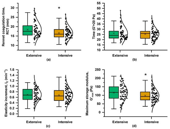 Figure 2 presents boxplots of the coagulation parameters and their variances across the two farming systems. RCT was significantly shorter in milk from the intensive system, although samples from both systems reached G′ = 20 Pa at nearly the same time and they exhibited similar IE values (Figure 3b,c). However, G′max, derived from the “plateau” phase of the coagulation curve, differed significantly between the two systems, with mean values of 115 Pa for the extensive system curds and 98 Pa for milk samples from the intensive farming scheme. The coagulation properties are influenced not only by milk composition, including protein and fat content, but also by pH level and SCC [14]. The greater variability in milk coagulation properties from the extensive system (Figure 3) may partly reflect the broader variation in compositional and other quality traits (Figure 2).