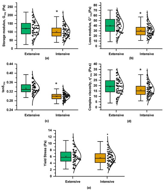Boxplots and distribution of rheological characteristics of rennet-induced curds (48 min after rennet addition) from the Skopelos breed goats of extensive and intensive farming systems derived from the frequency (strain 0.5% at 35 °C) and strain (frequency 1 Hz at 35 °C) sweep tests (as in Figure 1): (a) storage modulus at 1 Hz, G′1Hz; (b) loss modulus at 1 Hz, G″1Hz; (c) loss tangent at 1 Hz; tanδ1Hz; (d) complex viscosity at 1 Hz, η*1Hz; and (e) apparent yield stress (τy); t-test; * = p < 0.05.