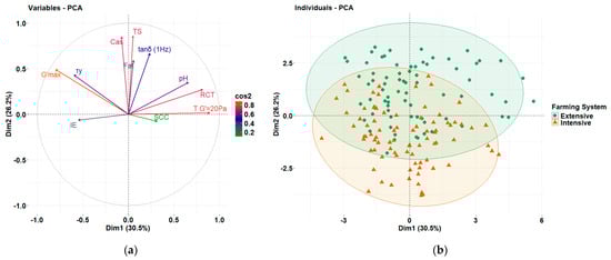 Pearson correlation analysis and SLAR identified some links between the rennet coagulation parameters and the farming system, which are primarily driven by the compositional characteristics as discussed above. For a better understanding, PCA was conducted using the compositional and quality characteristics of the milk, as well as the rheological properties derived from rennet coagulation kinetics and the evaluation of the resulting curds to evaluate the cheesemaking characteristics of milks from the two different systems. To ensure unique contributions to the component structure/matrix (and to avoid over-representing highly correlated metrics), the most representative variables were selected among the highly interrelated data sets. For example, RCT was selected over TG′=20Pa, as these variables were highly correlated; i.e., earlier coagulation onset corresponded to the curd reaching a G′ value of 20 Pa sooner (Table 1). From the frequency sweep test parameters, G′ was excluded as it is equivalent to G′max, while G′′ and η* were excluded due to their high correlation with G′ (and G′max). Among the compositional characteristics, casein was selected over total proteins content due to its direct involvement in gel network formation during cheesemaking. PCA extracted four components with eigenvalue above 1 (Table 3), with the first and second components explaining 56.7% of the variance. RCT, G′max, TG′=20Pa, IE, and τy along with pH were strongly associated with PC1 (Table 3 and Figure 5a), highlighting the critical role of pH in rennet-mediated coagulation kinetics and its strong relationship with the process time-related parameters. On the other hand, the compositional characteristics, such as fat, casein, and TS, were loaded onto PC2 and positively corelated with G′max, tanδ1Hz, and τy, justifying their importance on curd structure and emphasizing their importance in curd structure by influencing gel strength, interactions and rearrangement potential among the interconnected particles in the composite gel protein network structures, and syneresis. Finally, PC3 consisted only of compositional features, while IE and tanδ1Hz were also loaded to PC4 along with SCC (Table 3).
