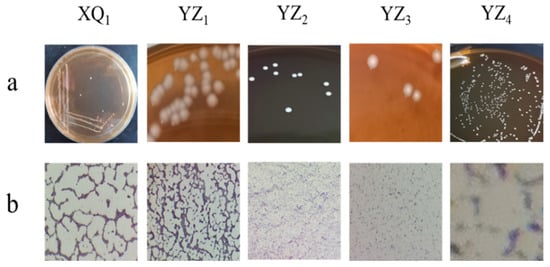 The physiological and biochemical characteristics of the isolated strains are presented in Table 2. Variations in carbohydrate fermentation capabilities were observed among different strains. All strains exhibited acid production and demonstrated the ability to ferment glucose, fructose, maltose, salicin, cellobiose, and esculin. In the catalase assay, YZ1 displayed positive catalase activity and motility, whereas the remaining four strains tested negative. Based on the LAB identification criteria established by Amelia et al. [24], YZ1 was not preliminarily classified as LAB, while XQ1, YZ2, YZ3, and YZ4 were initially identified as LAB strains. Furthermore, the gas-producing strain YZ3 exhibited characteristics of heterolactic fermentation [25].