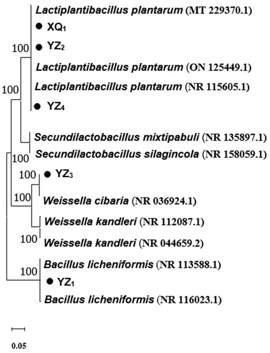 The sequence similarity of the obtained sequencing results was analyzed using the National Center for Biotechnology Information (NCBI) database through BLAST+2.16.0 (Table 3), and a phylogenetic tree was subsequently constructed (Figure 2). The homology analysis revealed that XQ1 exhibited 100% similarity to the Lactobacillus plantarum strain (DMR17), YZ1 shared 99.9% homology with the Bacillus licheniformis strain (BCRC 11702), YZ2 displayed 100% similarity to the Lactiplantibacillus plantarum strain (HBUAS59638), YZ3 demonstrated 99.9% homology with the Weissella cibaria strain (II-I-59), and YZ4 showed 99.9% similarity to the Lactiplantibacillus plantarum strain (JCM 1149). Consequently, XQ1, YZ2, and YZ4 were classified as Lactobacillus plantarum, YZ3 as Weissella cibaria, and YZ1 as Bacillus licheniformis, aligning with the physiological and biochemical identification results. The sequences exhibiting the highest similarity scores and total scores obtained from BLAST were considered the closest relatives of the isolates. All identified strains displayed greater than 99% similarity with sequences in the NCBI nucleotide database. The phylogenetic tree analysis further validated the identification and classification of the isolates (Figure 2), where each LAB isolate (indicated by triangles) was clustered with type strains from the database. Although Bacillus licheniformis is not categorized as LAB and lacks ensiling potential, previous studies have reported its probiotic properties and industrial relevance [26].