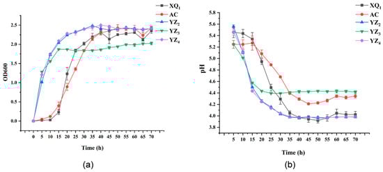 Following the modified methodology of Jain et al. [14], 20 mL of activated bacterial culture (OD600 = 1) was introduced into 200 mL of MRS broth. The culture was incubated at 37 °C with agitation at 160 r/min, and samples were collected at 5 h intervals until the stationary phase to assess acid production and bacterial growth capacity. For the evaluation of growth capacity, 5 mL of culture broth was extracted, and the OD600 value was recorded using the 0 h culture medium as the reference control. Acid production was assessed by determining the pH of the culture broth with a digital pH meter following the measurement of growth capacity.