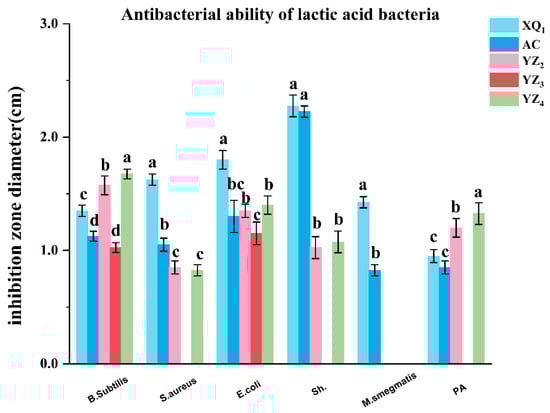 Antibacterial activity represents a fundamental characteristic of potential probiotic strains. In this study, Bacillus subtilis, Staphylococcus aureus, Escherichia coli, Shigella dysenteriae, and Pseudomonas aeruginosa were selected as indicator strains. The inhibition zone diameters of the isolated LAB strains against these pathogenic indicators are depicted in Figure 4. The results indicated that both XQ1 and the control strain AC exerted inhibitory effects against all tested indicator strains, with XQ1 displaying markedly stronger inhibition than AC against Bacillus subtilis, Staphylococcus aureus, Escherichia coli, and Shigella dysenteriae. YZ2 and YZ4 exhibited comparable antimicrobial properties, effectively inhibiting all indicator strains except Shigella dysenteriae and demonstrating markedly greater inhibition against Bacillus subtilis and Pseudomonas aeruginosa than the AC strain. Conversely, YZ3 exhibited only weak inhibitory effects against Bacillus subtilis and Escherichia coli.