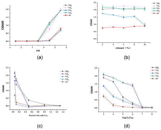 Acid tolerance (a), ethanol tolerance (b), bile salt tolerance (c), and osmotic pressure tolerance (d) of isolated LAB strains and commercial strain AC.
