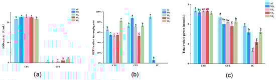 The antioxidant capacity of different strains was analyzed: SOD activity (a); DPPH radical scavenging ability (b); total antioxidant activity (c). Values are shown as means ± SD of three replications. CFS: cell-free supernatant; IC: intact cell; CFE: cell-free extract. Different letters in the same bar indicate significant differences (p < 0.05).
