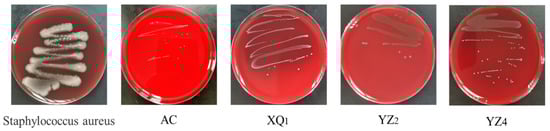 The evaluation of hemolytic activity is regarded as a key criterion in the selection of probiotic strains. Hemolysis refers to the rupture of red blood cells, resulting in the release of hemoglobin. The absence of a transparent zone is classified as non-hemolytic [50]. As illustrated in Figure 7, while Staphylococcus aureus exhibited pronounced hemolytic activity, the strains XQ1, YZ2, and YZ4, which were isolated from RRTP, demonstrated either no hemolytic activity or only minimal hemolysis. These findings suggest that these three strains are safe and can provide a basis for further safety evaluations.