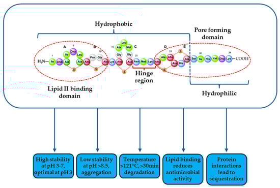Schematic representation of nisin A molecule integrating important physicochemical and functional properties.