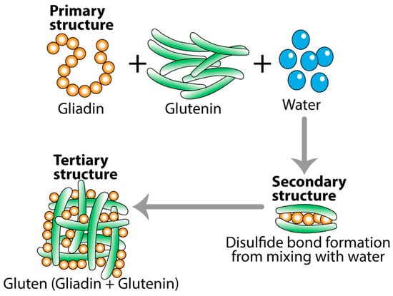 One of the best examples of the effect of temperature on the digestibility of food in the digestive tract is what happens to gluten protein and celiac peptides during baking [57]. During dough formation, gliadin and glutenin combine into an elastic protein network called gluten macropolymer (GMP) (see Figure 2). When the raw flour is mixed with water, the primary structure of the combined gliadin, glutenin, and water is transformed into the secondary structure of raw pizza or bread dough. During baking, the GMP structure is further altered to a degree that affects the digestibility and immunogenic properties of gluten, initiating immune responses during celiac pathogenesis [57].