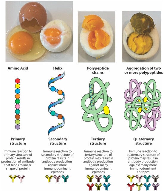 For example, in gluten-containing foods, heat, other cooking methods, or food additives like bacterial enzymes can alter gluten protein structures, forming new immunodominant epitopes. While some individuals may react to specific proteins in gluten’s primary structure (like gliadin or glutenin), others may only react to the complex, combined structure that gluten forms during food preparation. This structural shift can lead to a more intense immune reaction, as seen in certain autoimmune and inflammatory responses [50,52,55].