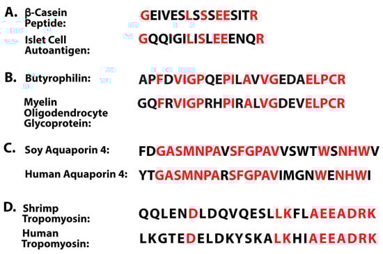 Molecular mimicry occurs when the amino acid (AA) sequence of a foreign substance shares similarity with the AA sequence of the body’s self-peptides to a degree that is sufficient to result in the cross-activation of autoreactive T and B cells and the production of antibodies that react with both the foreign and self-peptides. When the foreign protein or peptide comes from food, the result is molecular mimicry-based food immune reactivity. Normally, if undigested food proteins are somehow able to penetrate the gut barriers and enter the circulatory system, the body’s immune system will mount a response by producing defensive antibodies against those food proteins. However, if the food protein’s peptide sequence is sufficiently similar to the sequence of a human tissue, the immune system will produce antibodies against both the foreign matter and the self-tissue, resulting in autoreactivity and eventually autoimmune disease [79,80]. For instance, in one study on recent-onset insulin-dependent diabetes, a β-casein peptide in cow’s milk was shown to have antigenic similarity to islet cell autoantigen [81] (see Figure 5A). Other examples include milk butyrophilin (BTN) has significant homology with human myelin oligodendrocyte glycoprotein (MOG), as shown in Figure 5B, and food-sourced aquaporin-4 (AQP4), which is found in corn, soybean, spinach, tomato, and other plants, also shares sequence similarity with human AQP4, enough to cause significant cross-reactivity (see Figure 5C, which shows only soy). AQP4 has been implicated as having an important triggering role in the development of neuromyelitis optica (NMO), a neurologic disease characterized by inflammation of the optic nerve and spinal cord [82,83,84,85]. Finally, shrimp tropomyosin is similar enough to human epithelial tropomyosin for cross-reactivity to be possible (see Figure 5D), which may be why autoantibodies against human tropomyosin have been implicated as a causative agent in inflammatory bowel disorders [86,87,88,89,90].