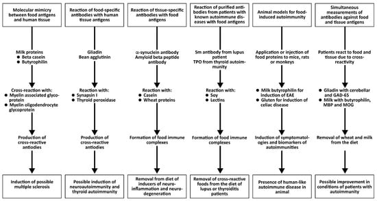 In addition to molecular mimicry and the reaction of food antibodies with human tissue, the reactivity of tissue antibodies with different food proteins and peptides is also important because it further confirms the contribution of food proteins and peptides to autoimmunity [118,119,120,121].