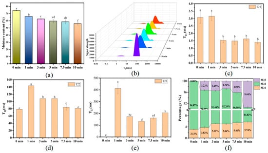 Change in the water content and water distribution of boiled beef under different boiling times. (a) Change in the water content of boiled beef during boiling. (b) T2 distribution curve of the boiled beef during boiling. (c) Change in the T21 value of boiled beef during boiling. (d) Change in the T22 value of boiled beef during boiling. (e) Change in the T23 value of boiled beef during boiling. (f) Change in percentage content of three different waters in boiled beef during boiling. Different letters in the same row indicates statistical difference (p < 0.05) with ANOVA using Duncan’s multiple range test.