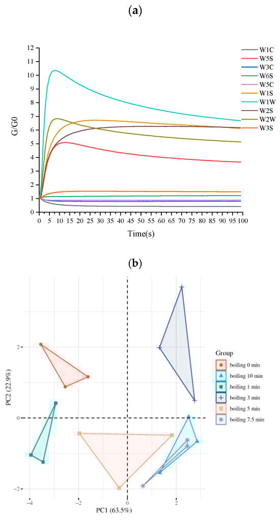 Analysis of E-nose data. (a) Radar plots of the responses of E-nose sensors to boiled beef. (b) Principal components analysis of E-nose data of boiled beef with different boiling time. The sensors included W1C (aromatic compounds), W3C (ammonia, aromatic compounds), W5S (nitrogen oxides), W6S (hydrocarbons), W5C (alkanes and aromatics), W1S (methane, broad range of compounds), W1W (sulfur compounds, terpenes), W2S (broad range, alcohols), W2W (aromatics and organic sulfur compounds), and W3S (methane and aliphatic compounds).