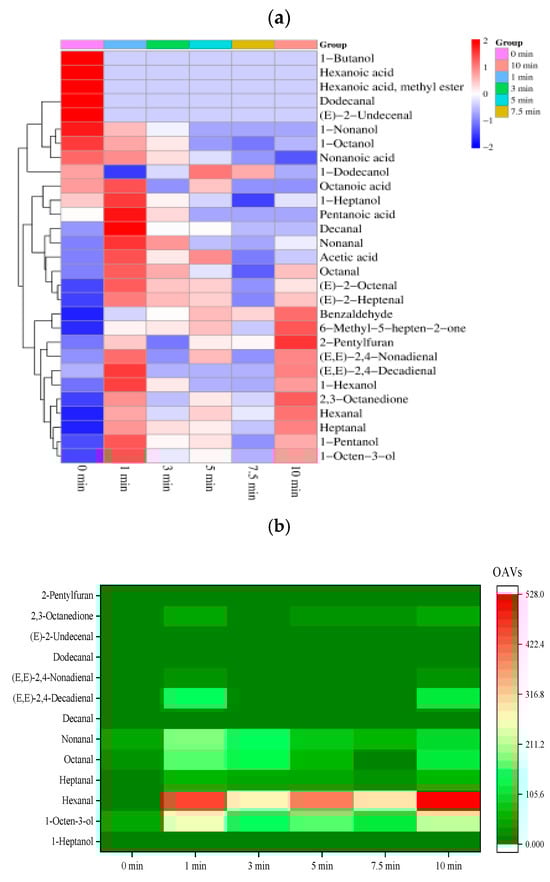 Analysis of volatile compounds in boiled beef. (a) Clustering heatmap of the contents of volatile compounds in boiled beef. (b) Changes in OAVs of aroma compounds (OAVs > 1) in boiled beef during the boiling process.