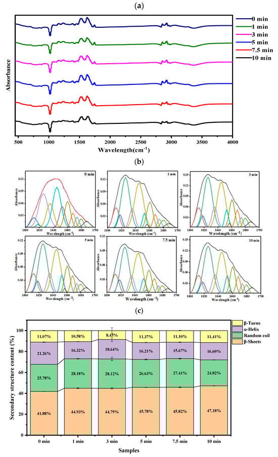 Infrared spectral analysis of the protein secondary structural composition of boiled beef. (a) Changes in FTIR spectroscopy (400–4000 cm−1) of boiled beef during boiling. (b) Decomposition of the boiled beef in the region of 1600–1700 cm−1. (c) Changes in the relative contents of protein secondary structures of beef (α-helix, β-sheets, β-turns, and random coil) during boiling.