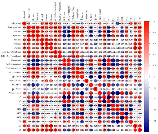 Correlation analysis among water content, color, protein secondary structure content, and levels of key volatile compounds. The red color represents positive correlation, and the blue color represents negative correlation.