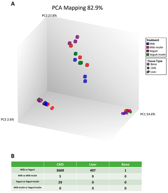 Transcriptomic profiling of CMS, liver, and bone tissue after a 6-week intervention with 4 different diets: Milk, Milk–Inulin, Yogurt, and Yogurt–Inulin. (A) PCA mapping of three tissues/organs with principal component (PC1), PC2, and PC3 explaining 54.6%, 27.8%, and 2.6% of the total variation, respectively. (B) The number of DEGs across groups and tissue types with a q-value of <0.10.