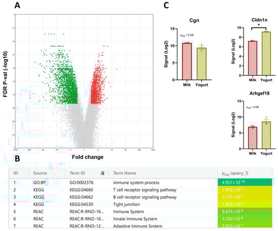 CMS transcriptomics after a 6-week diet intervention where the Milk and the Yogurt groups are compared. (A) Volcano plot shows 3669 DEGs with significant upregulated (green) and downregulated (red) genes highlighted. A q-value of <0.10 was used to determine significance. (B) Pathway enrichment analysis performed on the top upregulated genes. (C). Signal intensities of Cldnd1, Arhgef18, and Cgn. Reported values are LSMeans and bars indicate standard errors. The symbol * denotes significance at the level Padj < 0.05.