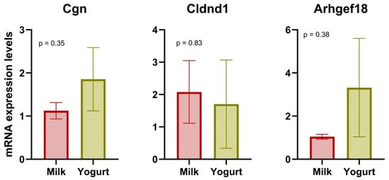 To support the transcriptomic analyses, real-time PCR was performed on three selected genes linked to tight junction function (Figure 3). While the results were not statistically significant, the mRNA expression level of Arhgef18 was higher for the Yogurt group, consistent with transcriptomic analysis.