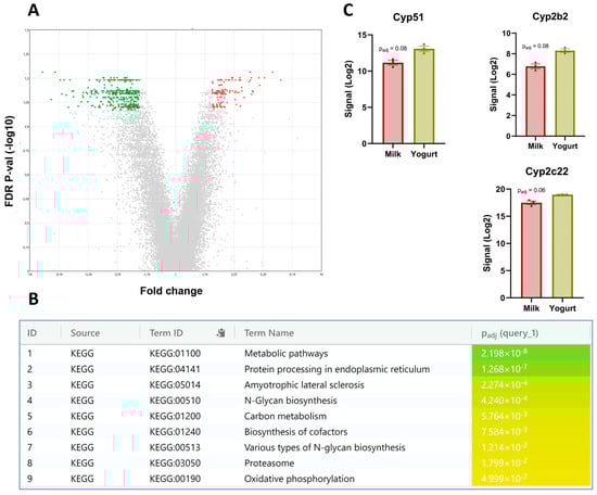 Liver transcriptomics after a 6-week diet intervention where the Milk and the Yogurt groups are compared. (A) Volcano plot shows 497 DEGs with significant upregulated (green) and downregulated (red) genes highlighted. A q-value of <0.10 was used to determine significance. (B) Pathway enrichment analysis performed on the top upregulated genes. (C) Signal intensities of Cyp51, Cyp2b2, and Cyp2c22. Reported values are LSMeans and bars indicate standard errors.