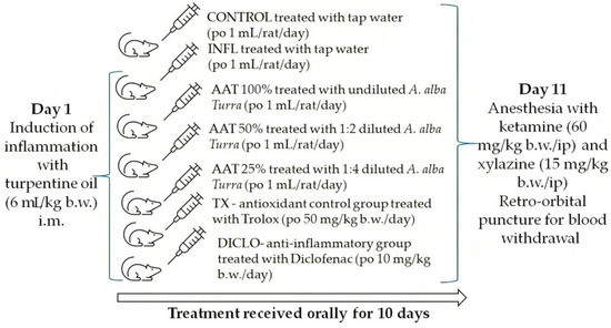 The adult male Wistar rats (200–250 g b.w.) were randomly assigned to 7 groups (n = 9). On day 1, inflammation was induced with a turpentine oil intramuscular (i.m.) injection, except in the negative control group (CONTROL). From day 1, the animals were treated by gavage for 10 days as follows: the CONTROL and inflammation group (INFL) received tap water, the A. alba Turra (AAT) experimental groups received different dilutions of the plant extract in distilled water (100%, 50%, and 25%), the antioxidant control group was given Trolox and the anti-inflammatory drug group received diclofenac (DICLO). On day 11, the animals were anesthetized, blood was drawn, and serum was stored for later use. The protocol is detailed in Figure 1.