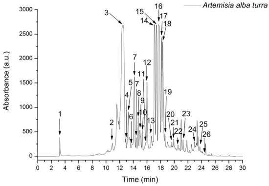 An HPLC-MS fingerprint of phenolic compounds extracted in Artemisia alba Turra ethanol extract. The peak identification is detailed in Table 1.