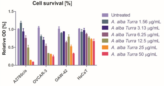 The compounds’ antiproliferative activity was expressed as a percent of the viable cells relative to the untreated control in A2780cis, OVCAR-3, OAW-42, and HaCaT cell populations subjected to Artemisia alba Turra extract at concentrations from 1.56 to 50 μg/mL.