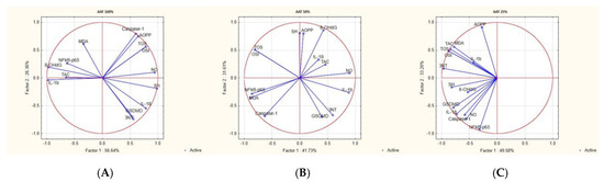The PCA results of oxidative stress and inflammatory biomarkers based on the correlation matrix with PC1 and PC2 for Artemisia alba Turra: (A) PCA for Artemisia alba Turra 100% (AAT 100%); (B) PCA for Artemisia alba Turra 50% (AAT 50%); (C) PCA for Artemisia alba Turra 25% (AAT 25%). TOS—total oxidative status; TAC—total antioxidant capacity; OSI—oxidative stress index; AOPP—advanced oxidation protein product; MDA—malonyldialdehide; NO—nitrites and nitrates; 3NT—3-nitrotyrosine; 8-OHdG—8-hydroxydeoxyguanosine; SH—total thiols; NfkB-p65—Nuclear factor- κB; IL-1b—Interleukine 1-b; IL-18—Interleukine 18; GSDMD—Gasdermine D.