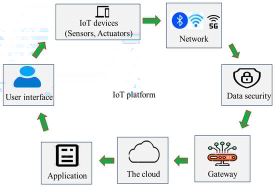 The IoT is an internet system that connects computer devices and mechanical and digital machines for communication and data sharing [4]. The key components of the IoT are presented in Figure 1. Incorpoating the IoT into food packaging could be the pivotal step for building smart technologies. It can facilitate wireless communication, data sharing, and automation. IoT platforms have different applications to promote sustainable food safety practices and promotion [13]. For example, IoT-enabled devices, such as humidity and temperature trackers, as well as radio frequency identification (RFID) chips, may gather crucial data by monitoring microbial counts, humidity, water activity, temperature, and so on during food storage and help verify authenticity and monitor expiration dates, addressing challenges like counterfeiting and food waste [57]. With IoT-enabled packaging, food products can be traced throughout the supply chain in real time, providing transparency and accountability. For instance, QR codes or near-field communication (NFC) tags on packages can provide detailed product information, including origin, nutritional content, and preparation tips [58]. These data, shared throughout the IoT and Internet hubs, help producers, retailers, and consumers make informed decisions. During food recalls, IoT systems can quickly locate sources of contamination, reducing food risks and minimizing economic losses [59]. Another key advantage of the IoT in food systems is to track vital signs of food contaminants from remote areas, like homes and supermarkets, during warehouse food storage and send data to food stakeholders, allowing them to monitor food conditions continuously and make early decisions. This is particularly useful for managing food waste, where early detection of changes can prevent economic losses and allow for quicker intervention and better outcomes. IoT devices can be attached to packages so that their journey through a supply chain or distribution network can be traced, and their condition during this journey (e.g., their temperatures) can be monitored.