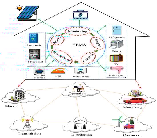 A schematic representation of a smart home system using HEMSs and smart grids [13].