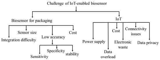IoT-enabled biosensors could have many potential scopes and opportunities to be employed in food packaging. These scopes and opportunities are critically very important to develop the food packaging system. However, some potential challenges and barriers have been found in the development of food packaging, depending on biosensors and the IoT. The most common challenges that have been described are as follows (Figure 4).