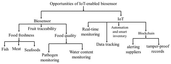 One of the most promising opportunities for IoT-enabled biosensors could be monitoring microbial contaminations and chemical hazards as well as producing online or offline expiration signals [68]. The major food contaminations occur through food pathogens, e.g., Salmonella, E. coli, and Listeria monocytogenes, as well as harmful chemicals such as pesticides and antibiotics. IoT-based biosensors could rapidly detect these food contaminants and alert stakeholders via cloud-based platforms [81]. Integrating such biosensors with IoT technologies (e.g., mobile applications and Wi-Fi) might have potential opportunities to provide food safety updates to warehouse managers and consumers and reduce foodborne illness outbreaks [82].