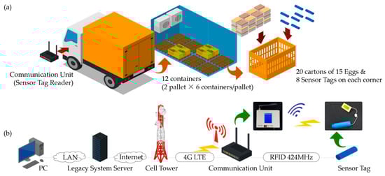 For this experiment, the sensor tags were placed inside ventilated plastic containers, commonly used for refrigerated food transportation (Figure 1a). Each container measured approximately 500 mm (L) × 350 mm (W) × 300 mm (H), was made of PE material, and featured perforations for airflow and drainage. Each container held 20 cartons of 15 eggs as food samples, with eight sensor tags strategically placed at the eight corners—four at the bottom and four at the top—to ensure comprehensive environmental monitoring.