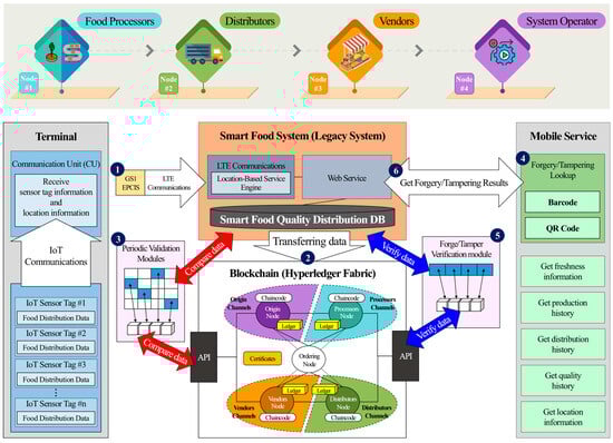 The system architecture follows a structured process to ensure traceability, tamper resistance, and real-time verification of food safety data. The six key processes depicted in Figure 2 are as follows: